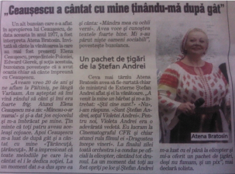 „Bunicul primea în casa lui să înnopteze toţi comercianţii care treceau prin sat. După ce îi punea la masă, toţi începeau ori să cânte, ori să spună o poveste ori un banc ca să bine-dispună oamenii. Cei mai mulţi cântau alături de bunicul şi aşa am început să cânt şi eu”, îşi aminteşte Atena Bratosin Stoian. |