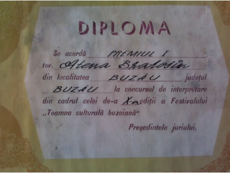 Mi-am reluat activitatea artistică după ieşirea la pensie. Nu cânt pentru bani, ci pentru păstrarea tradiţiilor. Îmi place să cânt folclor de Buzău. Altfel sunt condiţiile acum faţă de ce era înainte.” (Atena Bratosin Stoian)